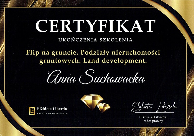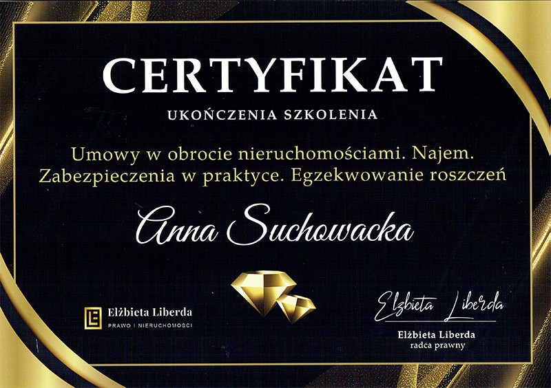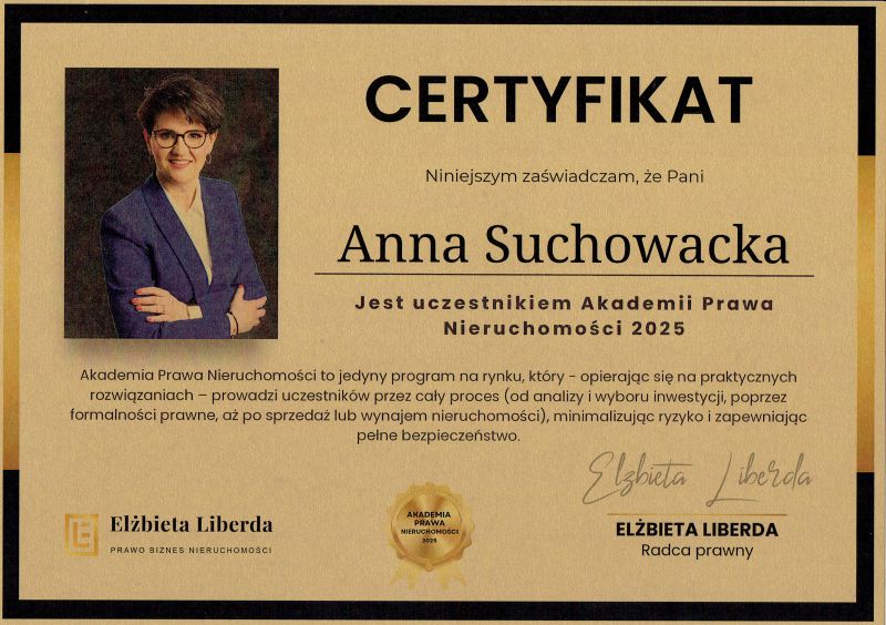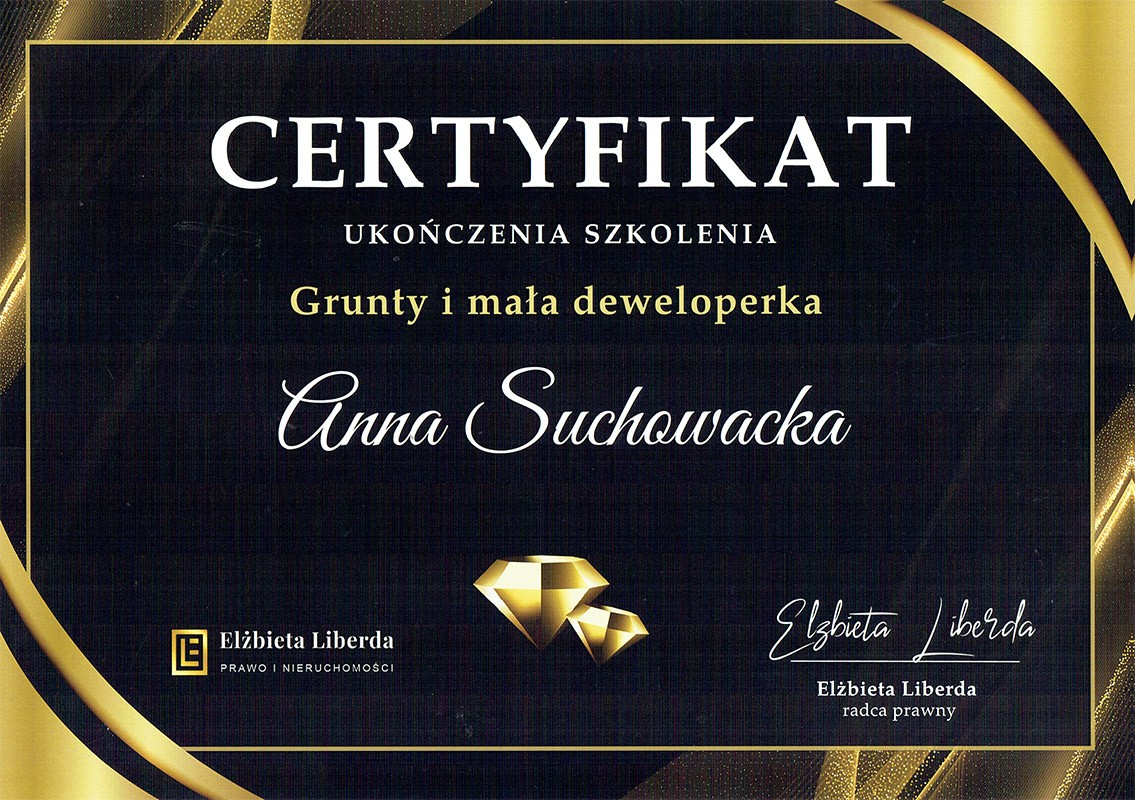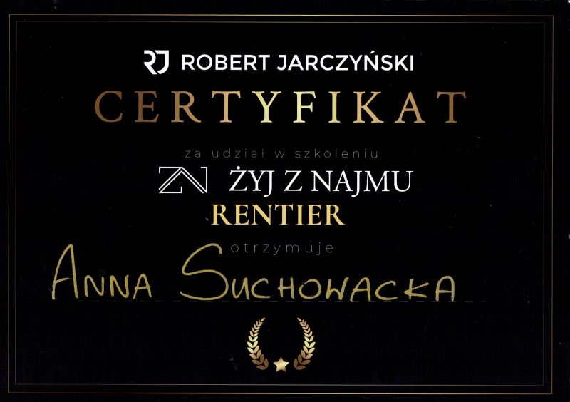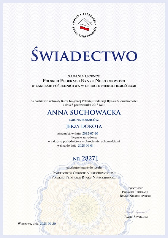 Jestem absolwentką podyplomowych studiów „Pośrednictwo w obrocie nieruchomościami” na Uczelni Łazarskiego w Warszawie, gdzie zdobyłam wszechstronną wiedzę z zakresu prawa mieszkaniowego, prawa budowlanego, gospodarki nieruchomościami, zarządzania i ekonomii. Posiadam licencję zawodową pośrednika w obrocie nieruchomościami nr 28271 wydaną przez PFRN – Polską Federację Rynku Nieruchomości, a także certyfikat negocjatora nr 107 Szkoły negocjatorów Wojtka Woźniczki. Kontynuując rozwój zawodowy, uczestniczyłam w doskonałych szkoleniach Sandler Training Polska, które prowadzili cenieni specjaliści, tacy jak Krzysztof Rzepkowski, Arkadiusz Gleń czy Jakub Matuszkiewicz.
